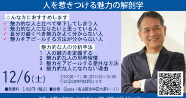 仕事、家庭、恋愛で使える「魅力的な人」は何が違うのか?-人を惹きつける魅力の解剖学-日 時 12月6 (土) 午前の部10:00-11:3…