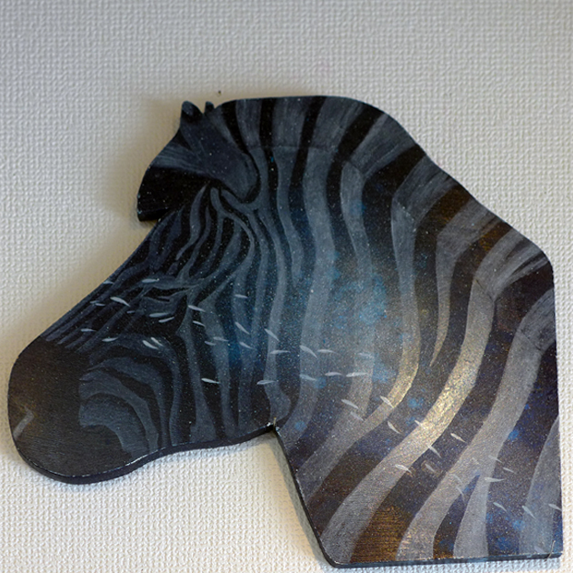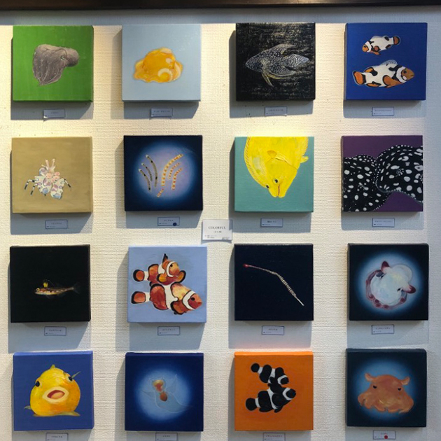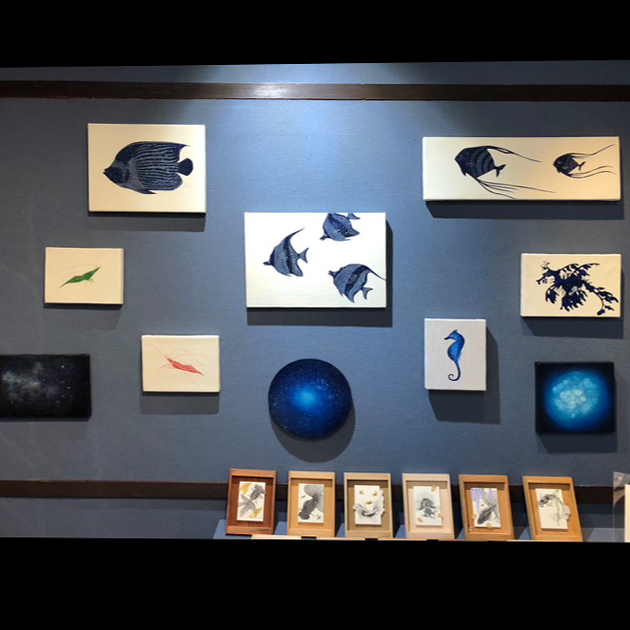 今回の個展で、海の生き物ではない作品が二点だけ展示されていました。キリンとシマウマの頭を板材で型取った作品です。色合いは彼女のシンボルカラーの藍色のままですが、作品の題材を海の生き物以外に求めた作品として、表現の幅を広げる価値あるチャレンジだったと思います。海の色でキリンやシマウマが描かれ、小魚が泳いでいる表現もプラスされているダブルイメージも良かったです。