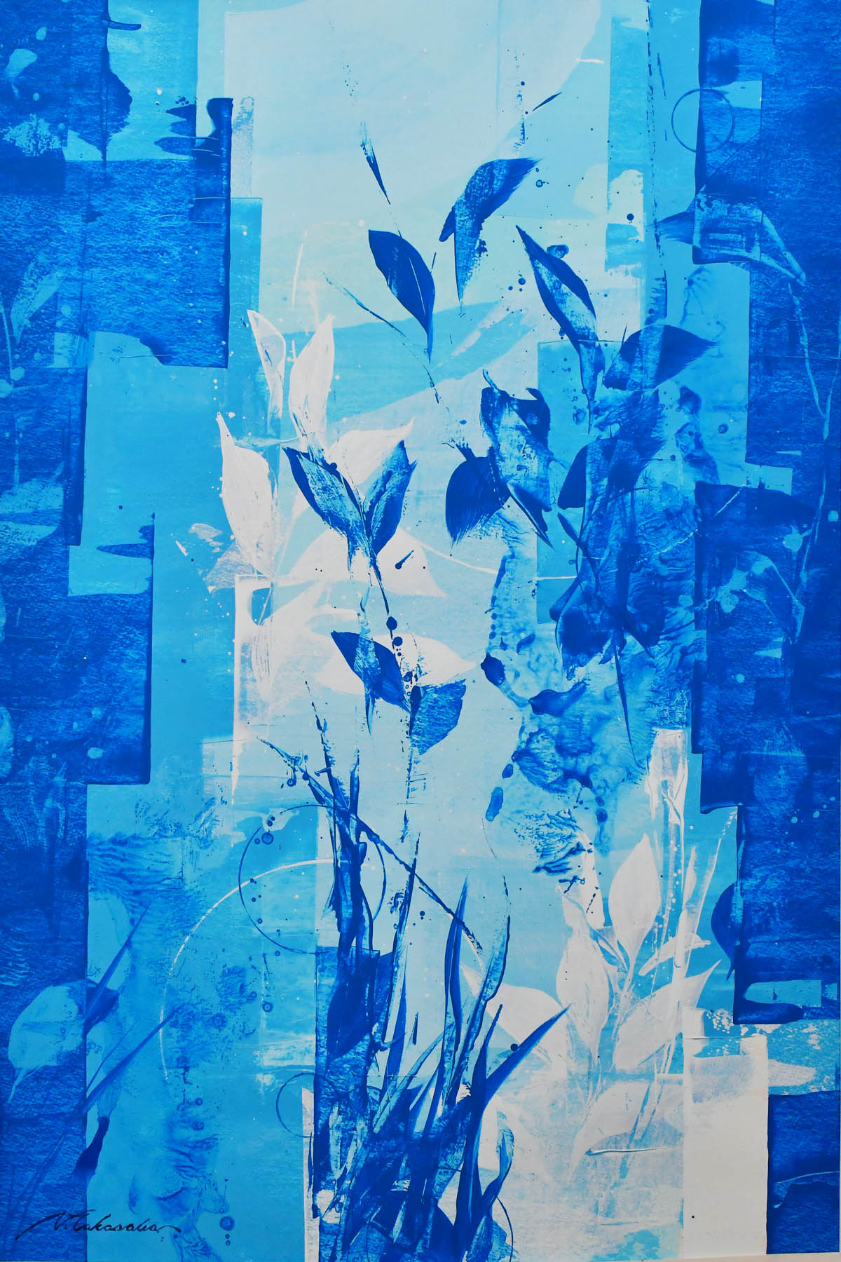 植物のシルエットは素材として使いますが、それは植物の写生では無く、画面を構成する一つの要素に過ぎません。コンクリートの壁に映った影のような存在なのです。具象と抽象の境界領域により、観る人の想像力と感性に訴える絵を描きたいと思っています。