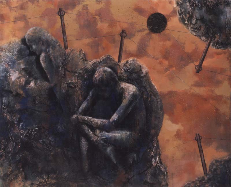固定観念に囚われ石化したように岩に閉じ込められている人間、砂漠化した大地と黒い太陽、そんなイメージで描いた作品のメッセージ性を高く評価していただけたことを本当に嬉しく思いました。